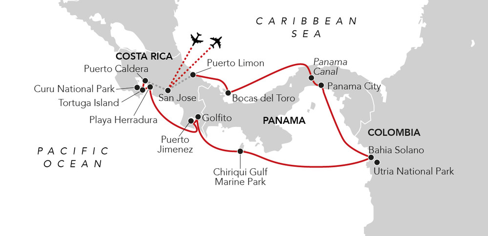 Our voyage begins and concludes in Costa Rica which, although small in size has a particular topography and position between the Atlantic and Pacific oceans which results in it being one of the most biologically diverse places on earth with teeming rainforest, cloud forest, hot volcanoes and a remarkably diverse landscape and culture. Added to this is the famous wildlife of the region: spider, howler and capuchin monkeys, coatimundis and over 300 species of birds including brilliant toucans and scarlet macaws which we will discover during our guided walks through some stunning national parks including the Cahuita National Park, Golfito National Wildlife Refuge and the Carara National Park. In addition to our time in Costa Rica and Panama, we have the added advantage of time to discover the magnificent natural wonders of Colombia where we find the Utria National Park, a tropical forest which reaches down to the sandy beaches.